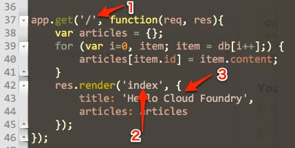 所以以剛剛的範例來說 title: ‘Hello Cloud Foundry’ 就會被 layout.jade 的 title= title 吃走