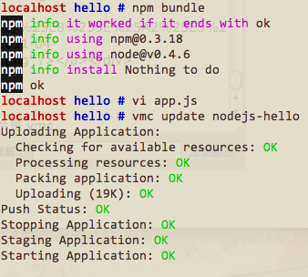 最後 如果計畫案有修改想要更新的話一樣先打 npm bundle 之後指令是 vmc update <appname> (比方說 nodejs-hello)